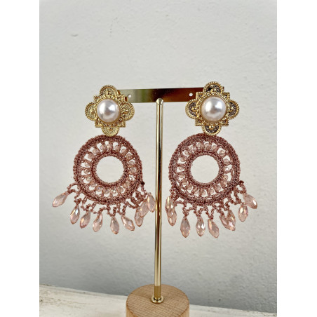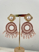 Pendientes largos en rosa maquillaje con detalles en dorado y terminación en lágrima. Perfectos para ferias y flamenca. Disponibles en negro con el nombre 'pendientes Iki'. Acero inoxidable